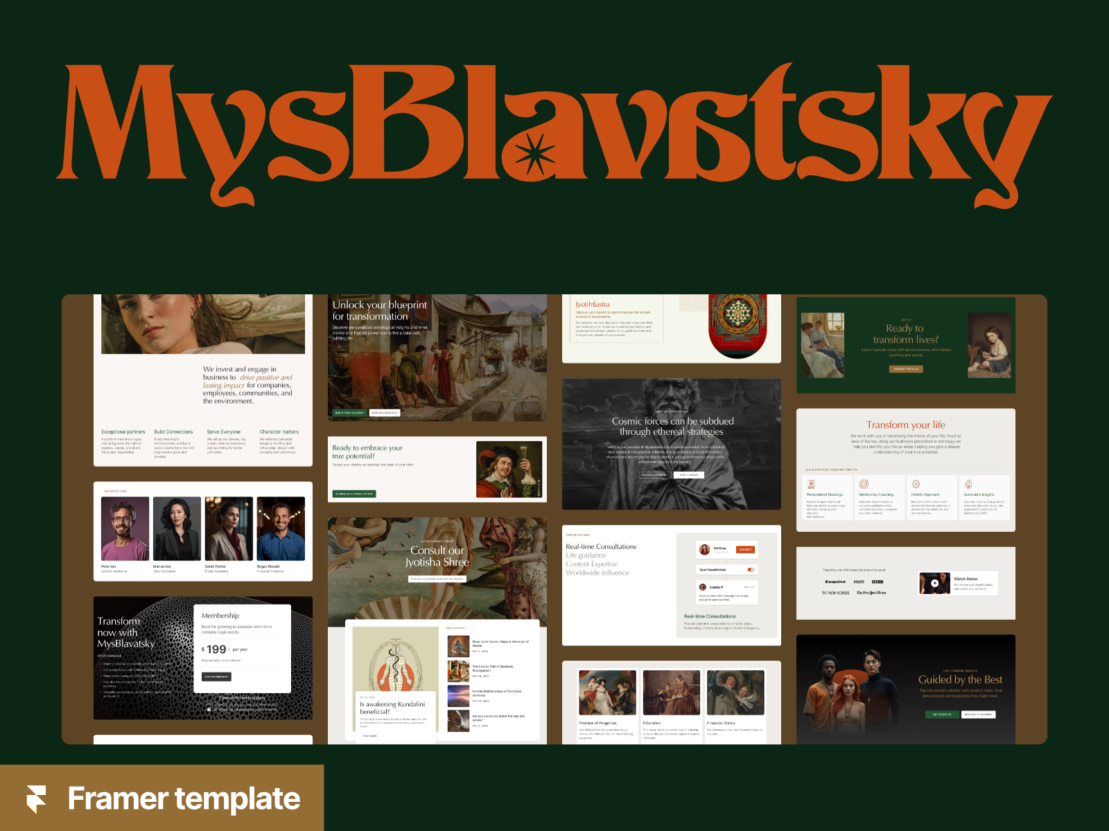 MysBlavatsky is a multi-layout contemporary Framer template designed to give emerging businesses, creative agencies, personal brands, and startups a compelling online presence. Designed with a user-first approach, this template is perfect for building brand awareness, launching new products, selling courses, or showcasing services.